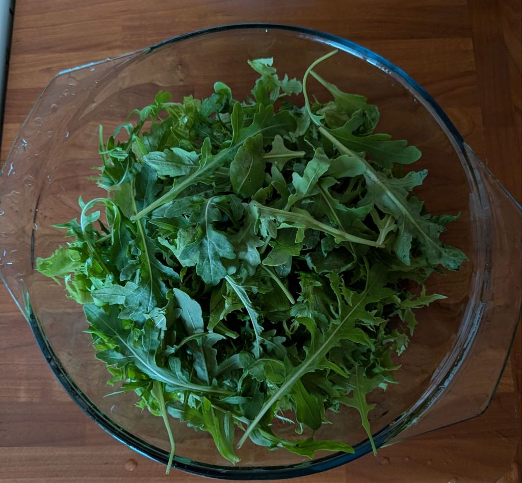 I started by washing some salad greens and tearing them into bite-sized pieces. (Optional, but delicious: toss in some arugula/rucola if you love that peppery kick!)