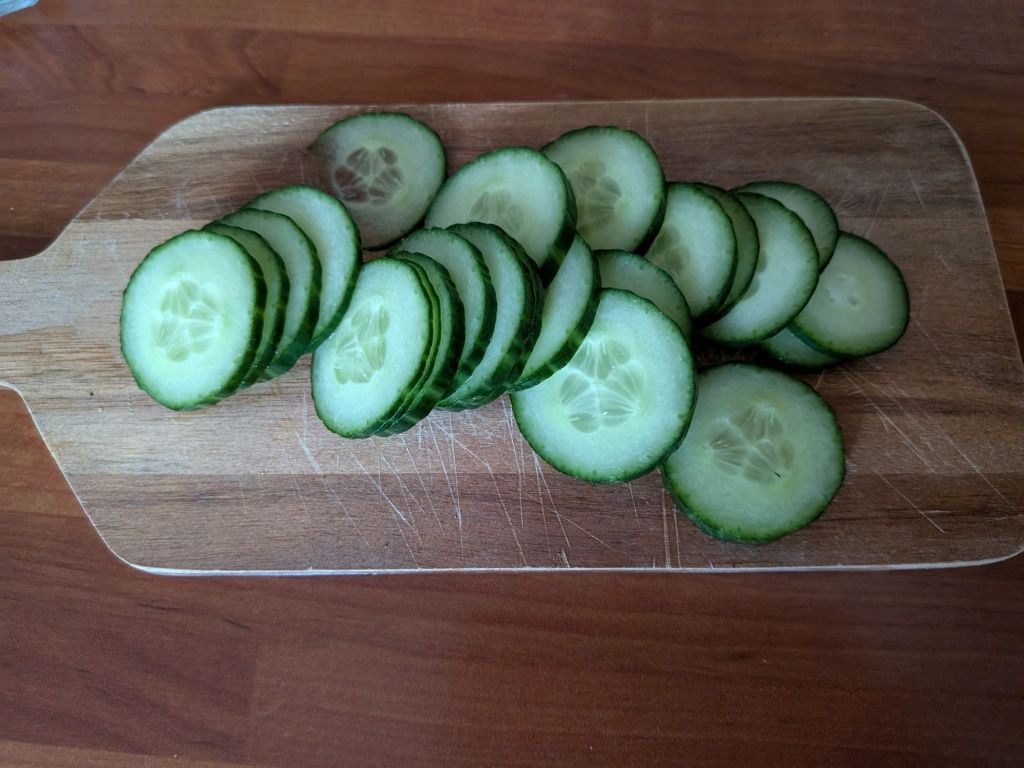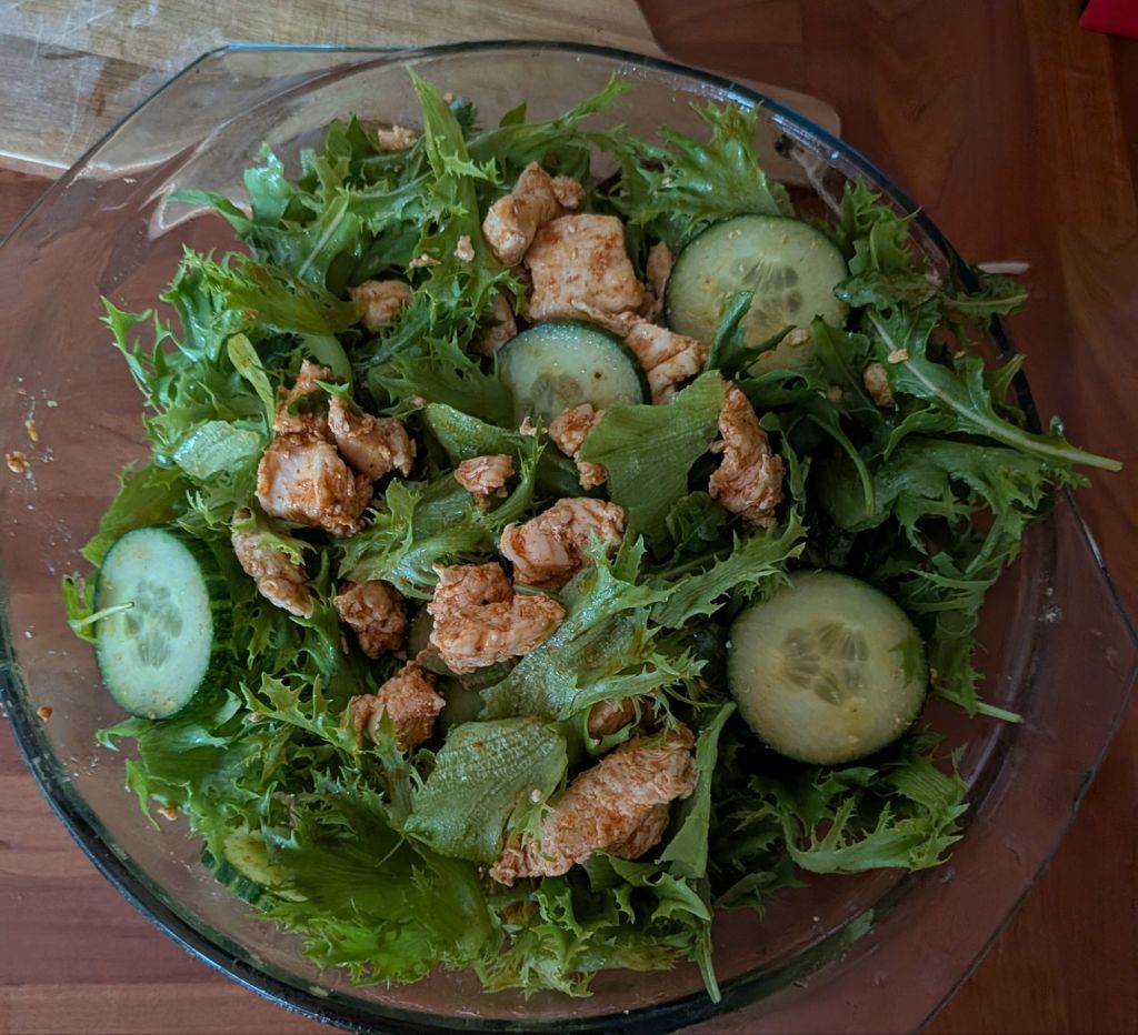 Next, I sliced up some cucumber for crunch and added it in. Then came the chicken—mine was cooked at home, but honestly, if you’re short on time, using pre-cooked chicken from the store works just as well. If you go that route, this recipe is solidly Level 1—the only extra effort is chopping cucumber, and I don’t think that’s enough to raise the difficulty up.